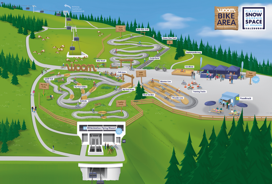 Die woom bike area befindet sich in Wagrain im Salzburger Land und liegt direkt an der Mittelstation der Flying Mozart Gondelbahn im Gebiet Snow Space Salzburg. Auf einer Fläche von rund 5.900 Quadratmetern wurde hier ein speziell auf Kinder ausgerichtetes Bikeareal geschaffen, das sowohl spielerische Bewegung als auch erste technische Erfahrungen auf dem Fahrrad ermöglicht. Die Anlage richtet sich gezielt an Kinder im Alter von etwa zwei bis vierzehn Jahren und kombiniert unterschiedliche Übungsbereiche mit abwechslungsreichen Streckenführungen.