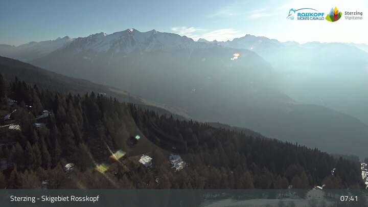 Die Kamera steht an der Bergstation der Seilbahn am Rosskopf und zeigt die Stubaier Alpen.