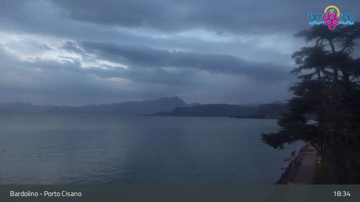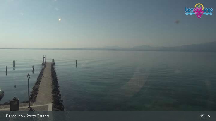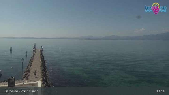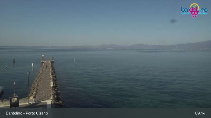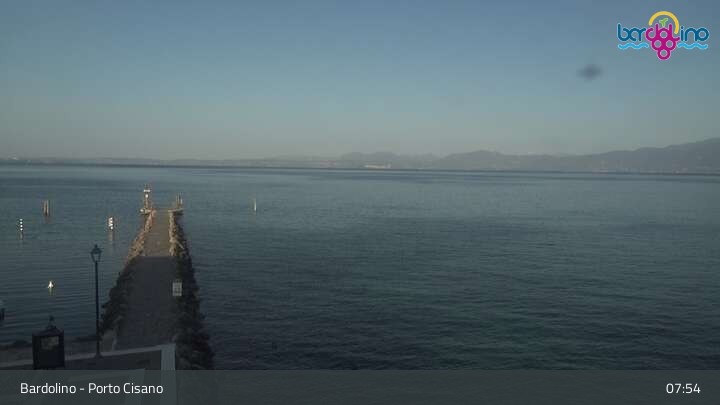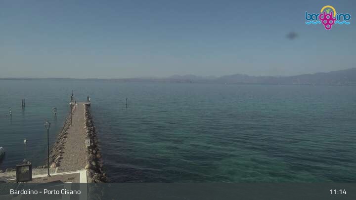 Die Kamera befindet sich am Strand Lido Mirabello und blickt nach Norden auf den Hafen von Bardolino am Gardasee.