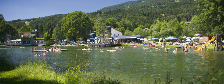 - Familien mit Kindern freuen sich über eine Wasserrutsche und einen Kinderspielplatz am Badesee.