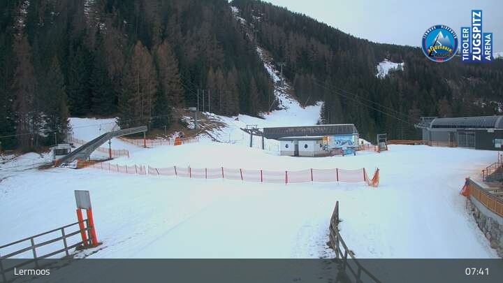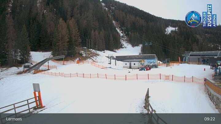 Die Webcam befindet sich an der Bergstation des Hochmoos Express in Lermoos und blickt auf die umliegenden Alpen.