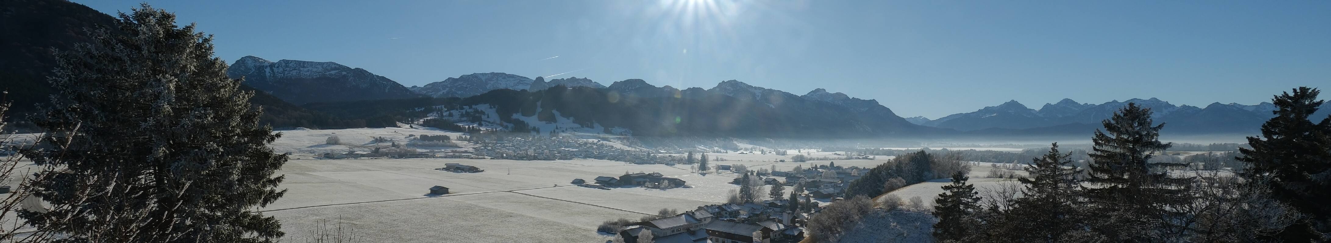 Die Kamera befindet sich in Berghof bei Halblech und blickt über Buching zum Buchenberg und dem Bannwaldsee. Bei guter Sicht ist sogar das Schloss Neuschwanstein zu sehen.
