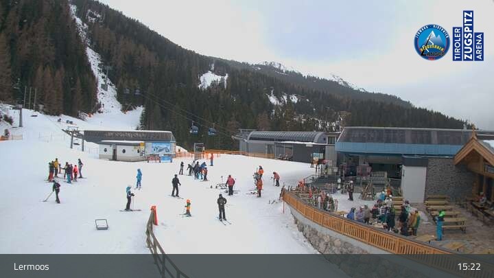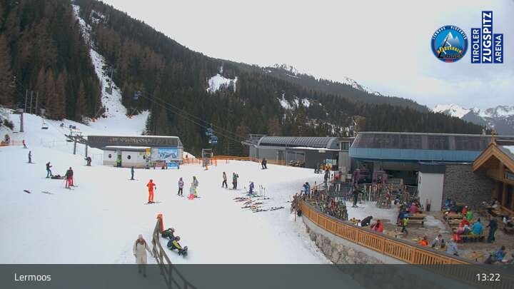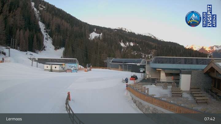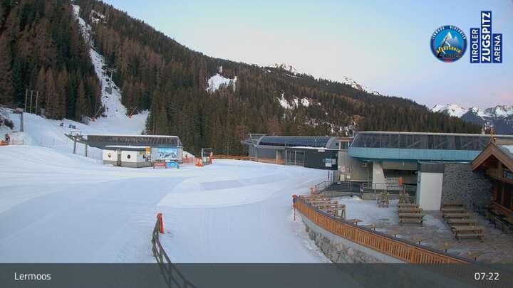 Die Webcam befindet sich an der Bergstation des Hochmoos Express in Lermoos und blickt auf die umliegenden Alpen.