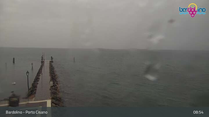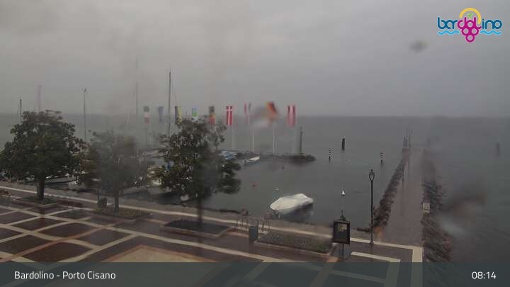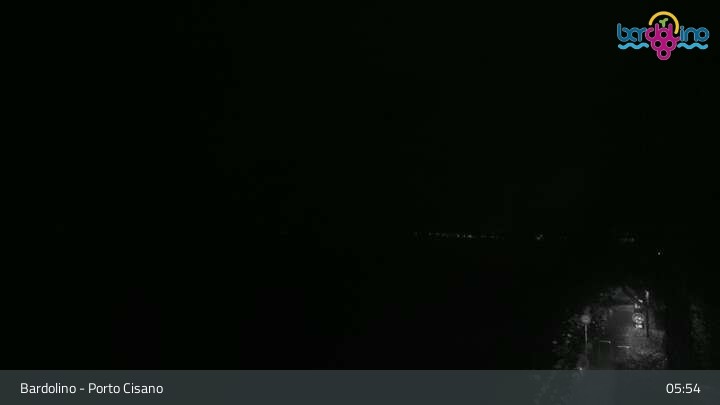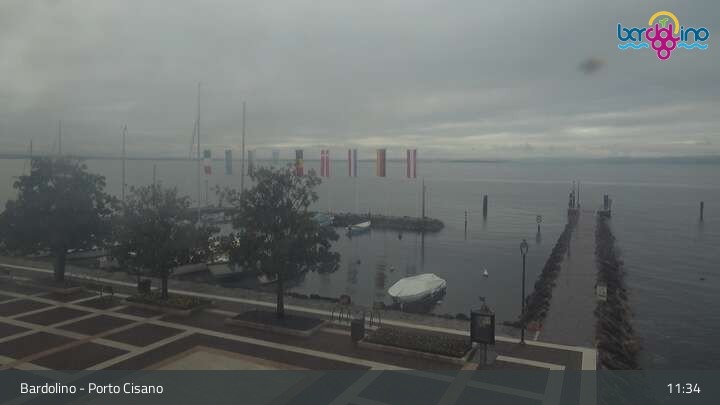 Die Kamera befindet sich am Strand Lido Mirabello und blickt nach Norden auf den Hafen von Bardolino am Gardasee.