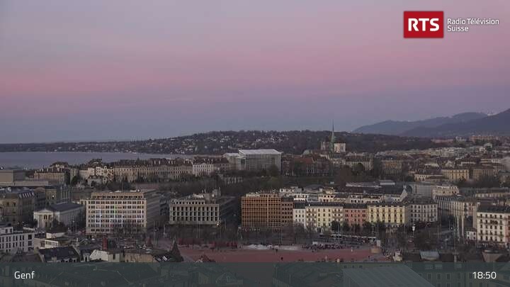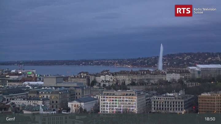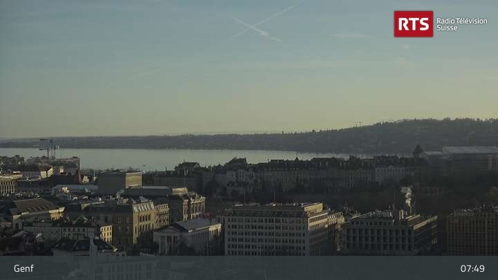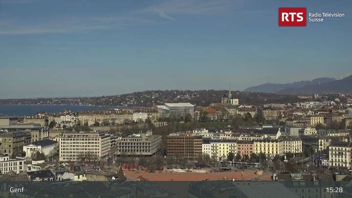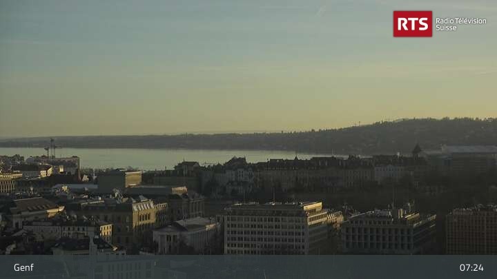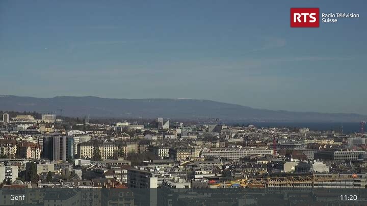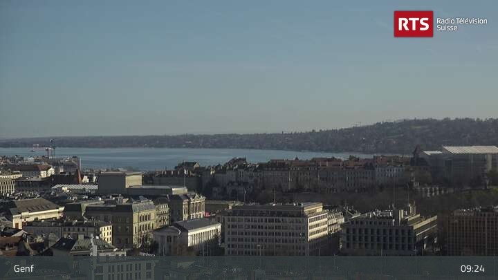 Hier siehst du den Blick vom RTS (Radio Télévision Suisse) Hochhaus in der Schweizer Stadt Genf.