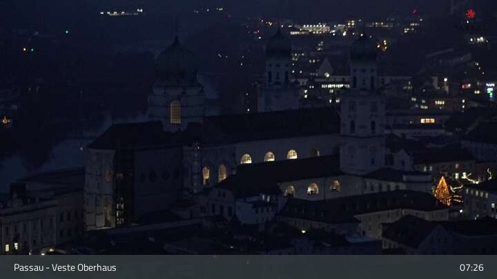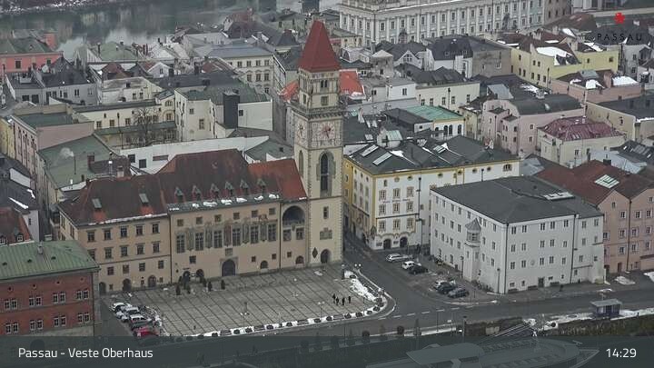 Die Webcam zeigt dir den Blick von der Veste Oberhaus über die Donau zur Altstadt der niederbayerischen Stadt Passau. Sehr gut zu erkennen sind links Teile der Burgveste, die Ortspitze wo die drei Flüsse Donau, Inn und Ilz zusammenfließen, die Hängebrücke über die Donau und rechts der weiße Stephansdom.