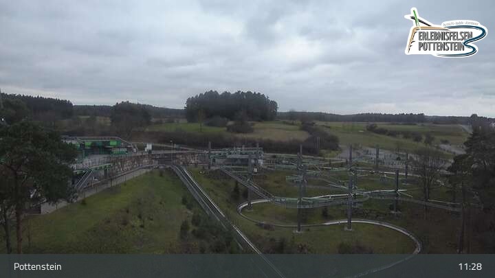Toller Panoramablick auf den Erlebnisfelsen Pottenstein und seine Attraktionen. Es gibt dort zwei Rodelbahnen, den Hexenbesen als eine Art Achterbahn, einen Skywalk und eine Trampolinanlage.