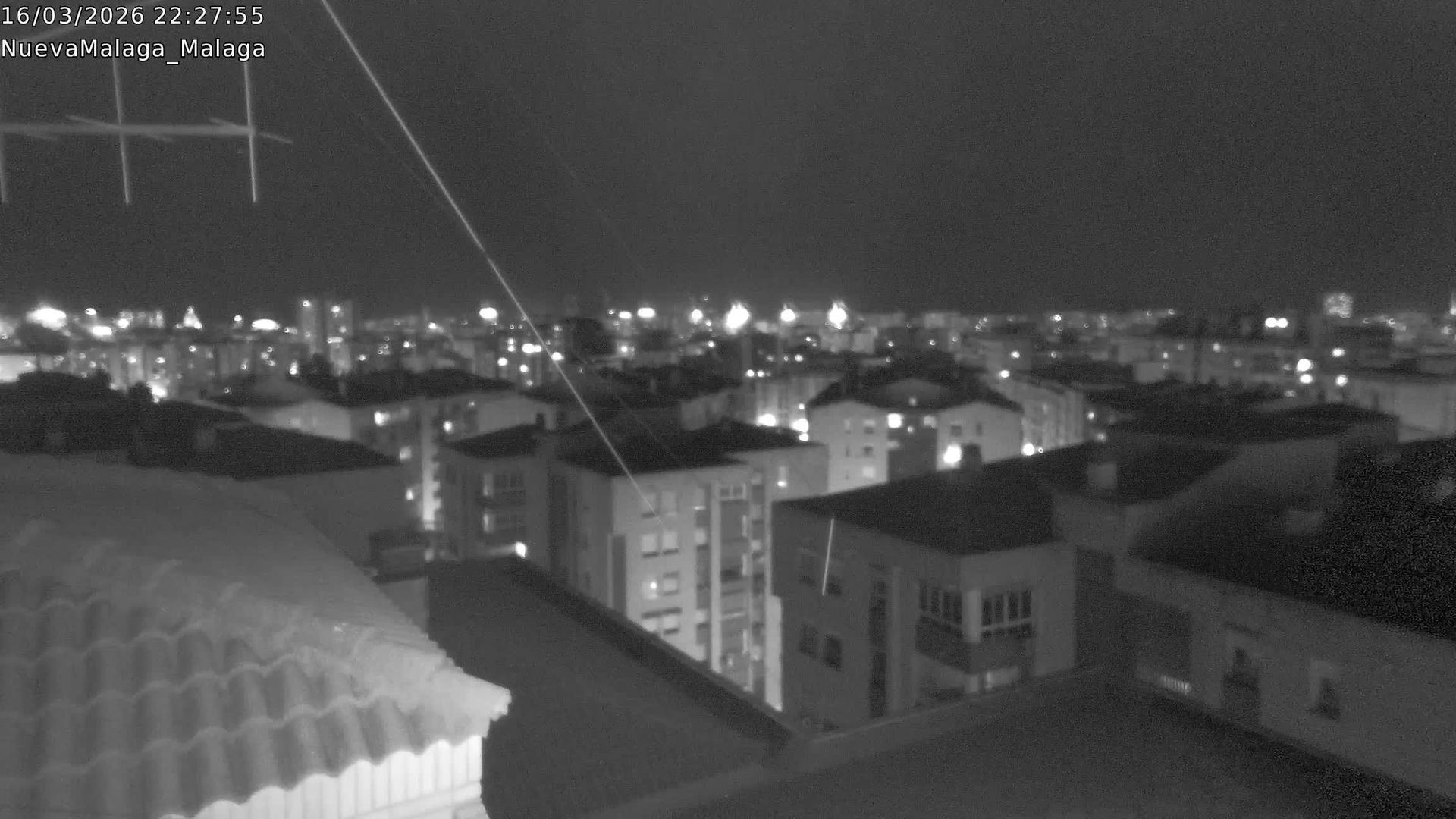 Man blickt über die Dächer eines neueren Stadtteils von Málaga bis hinaus in die Ferne auf das Mittelmeer an der Costa del Sol.