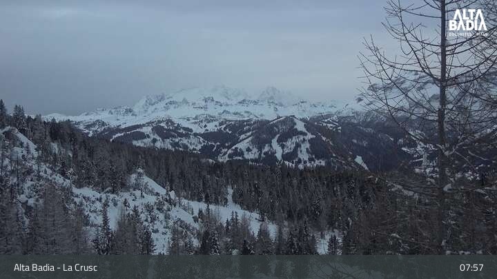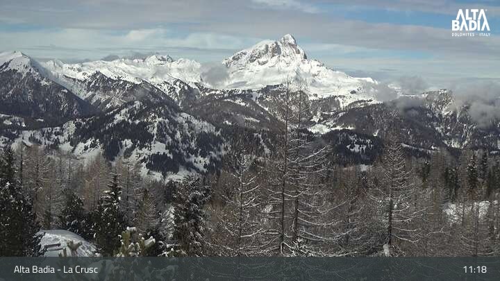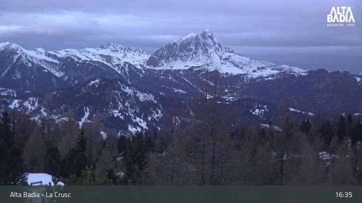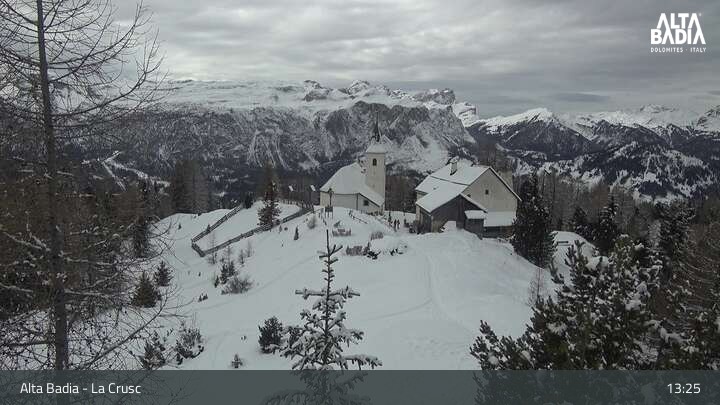 Blick von der Bergstation des La Crusc Sessellifts auf die Berge rund um Alta Badia. Die kleine Kirche ist ein beliebtes Wallfahrtsziel.