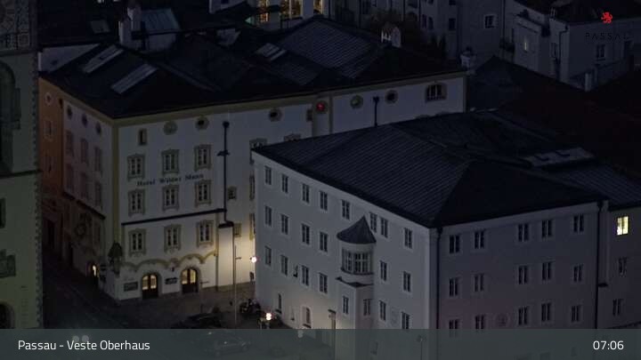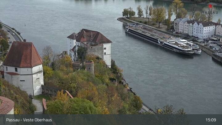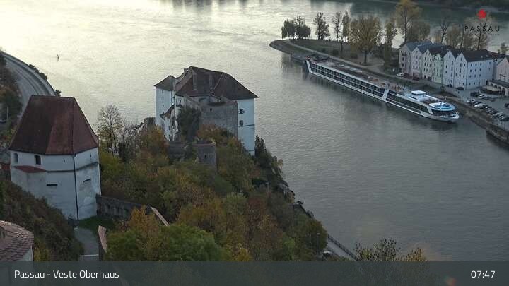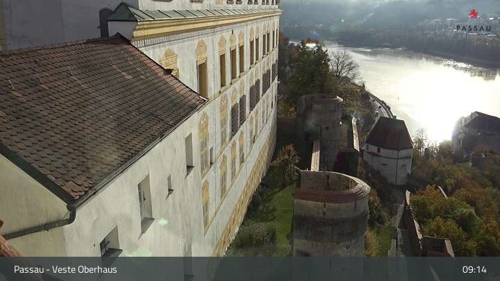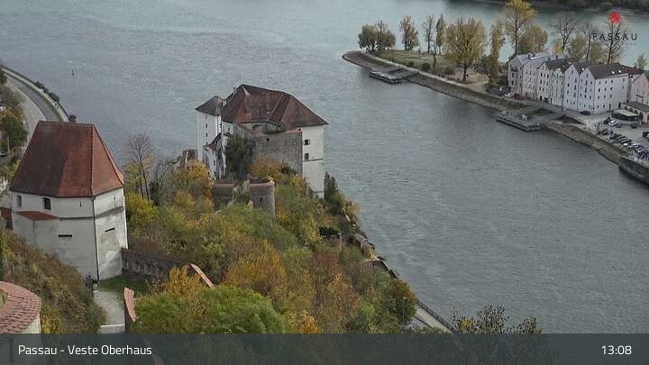 Die Webcam zeigt dir den Blick von der Veste Oberhaus über die Donau zur Altstadt der niederbayerischen Stadt Passau. Sehr gut zu erkennen sind links Teile der Burgveste, die Ortspitze wo die drei Flüsse Donau, Inn und Ilz zusammenfließen, die Hängebrücke über die Donau und rechts der weiße Stephansdom.