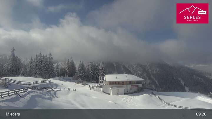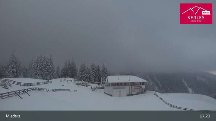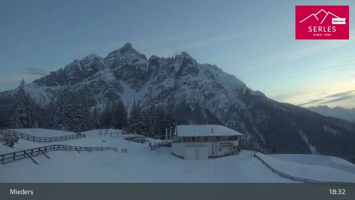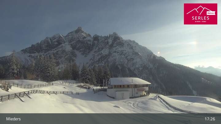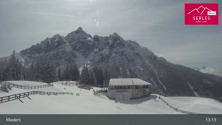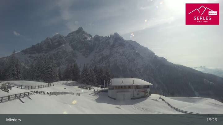 Die Webcam eröffnet den Blick von der Bergstation Koppeneck auf den Hausberg von Mieders, die Serles. Zu sehen sind außerdem das Bergrestaurant Koppeneck mit Kinderspielplatz und der Speichersee.