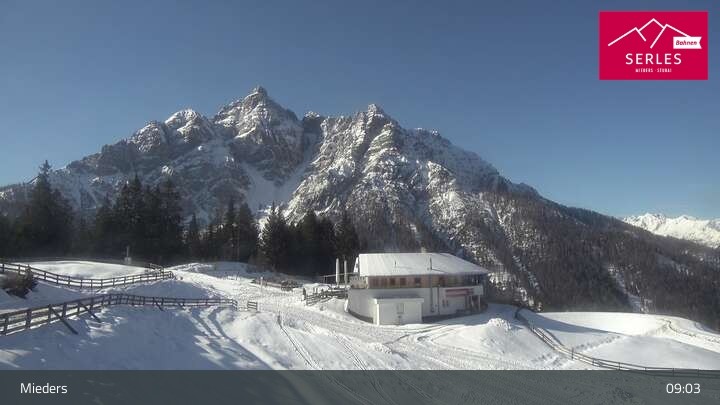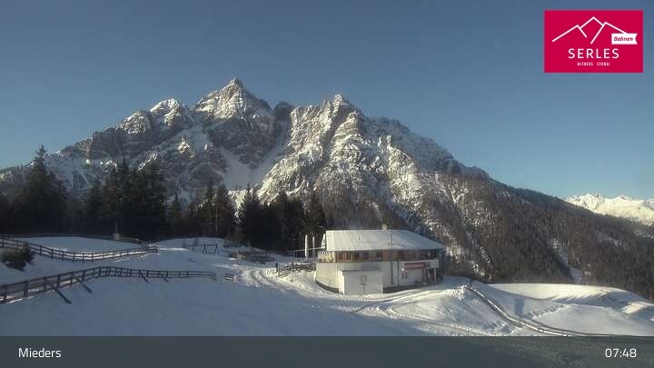 Die Webcam eröffnet den Blick von der Bergstation Koppeneck auf den Hausberg von Mieders, die Serles. Zu sehen sind außerdem das Bergrestaurant Koppeneck mit Kinderspielplatz und der Speichersee.