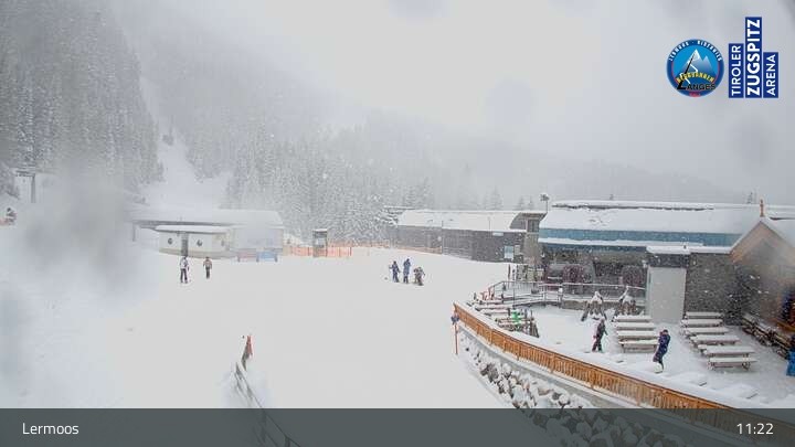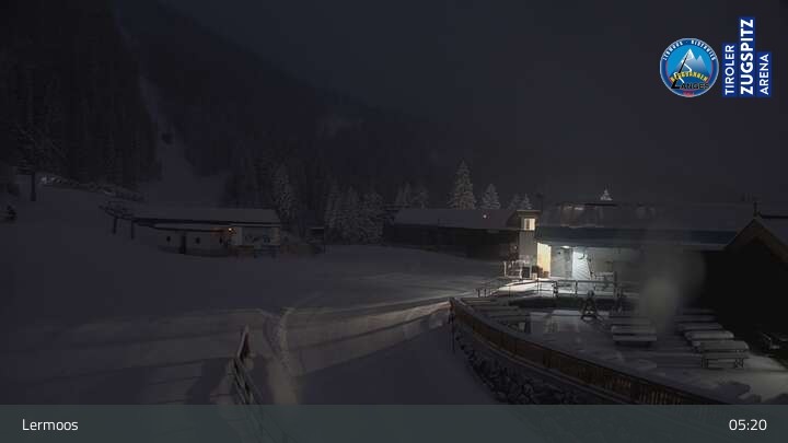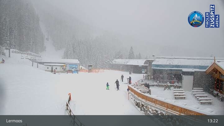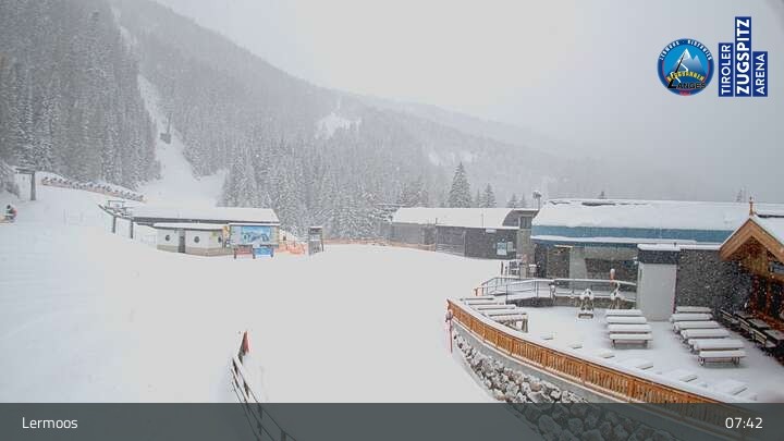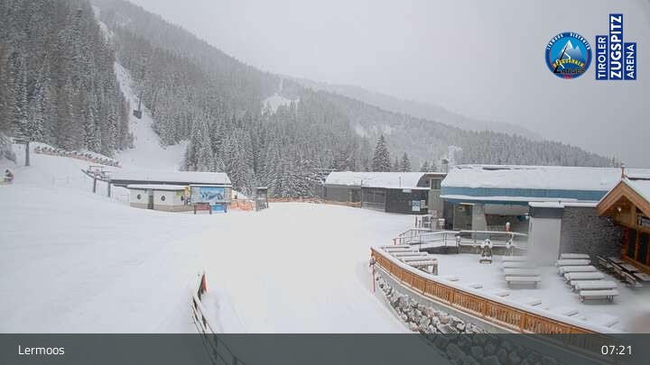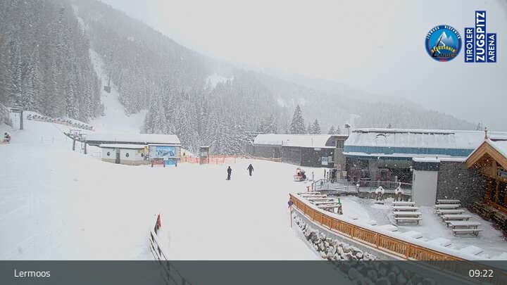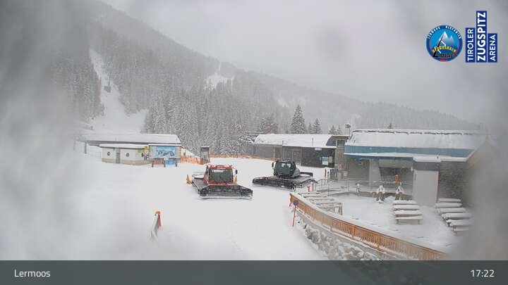 Die Webcam befindet sich an der Bergstation des Hochmoos Express in Lermoos und blickt auf die umliegenden Alpen.