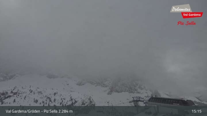 Ausblick von der Bergstation am Piz Sella in Val Gardena in Südirol. Zu sehen sind u.a. der Langkofel und die Sellagrupee.