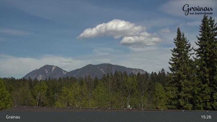 Die Live-Webcam zeigt vom Freibad aus einen Rundumblick auf das Bergdorf Grainau und seine Umgebung. Zu sehen sind unter anderem die Zugspitze, der große und kleine Waxenstein sowie der Hohe Ziegspitz.