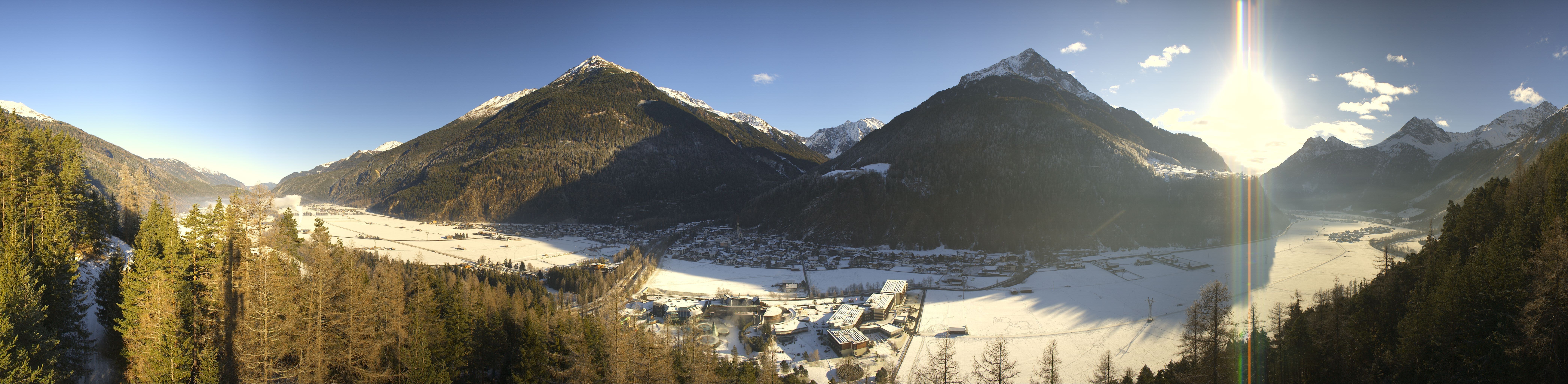 Zu sehen ist der Ort Längenfeld im Ötztal und die umliegende Bergwelt.