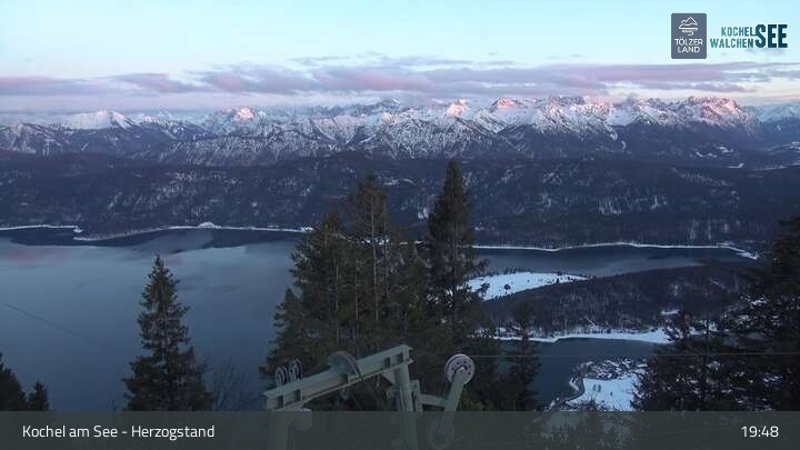 Panorama-Live-Kamera am Herzogstand im Tölzer Land. Unter anderem ist auch der Kochelsee zu sehen.