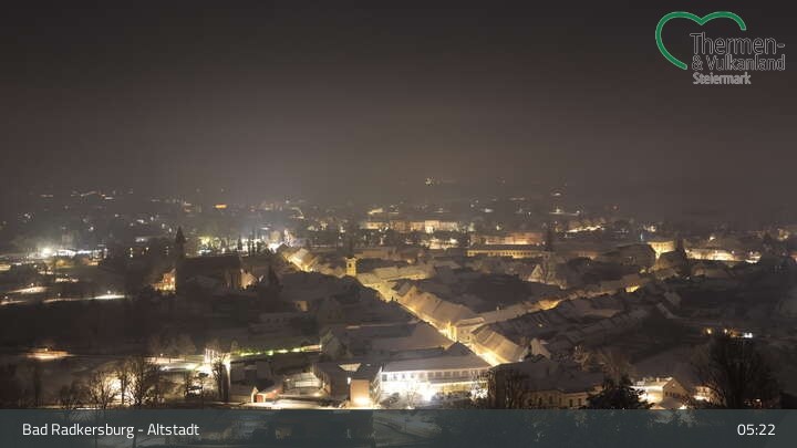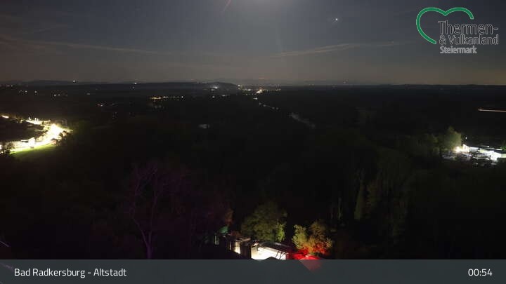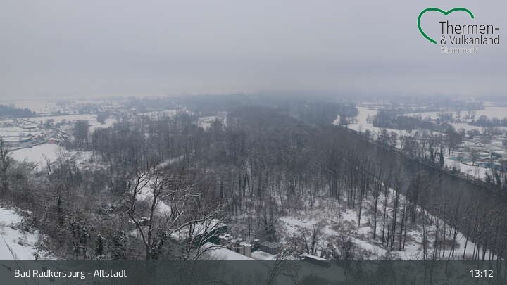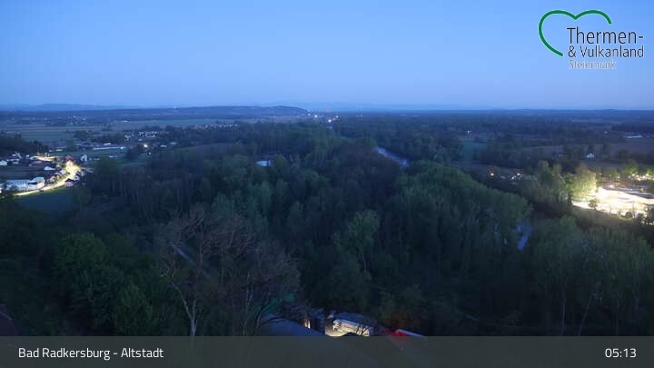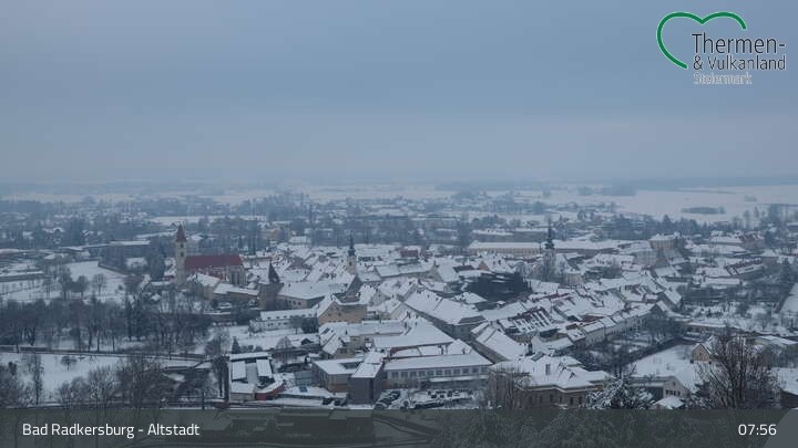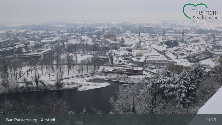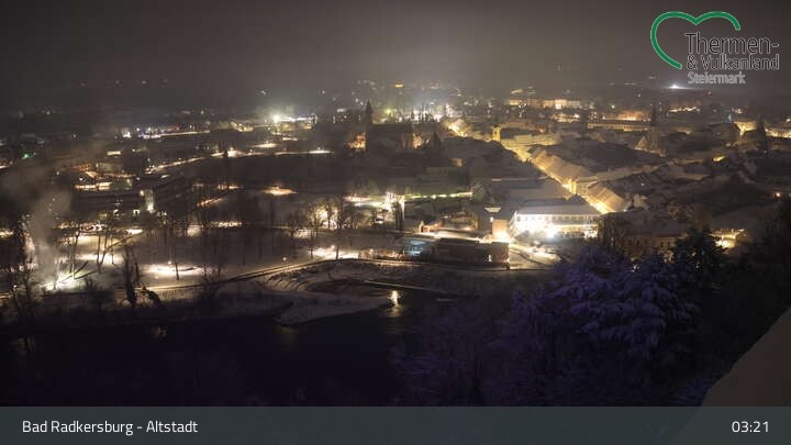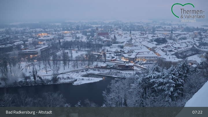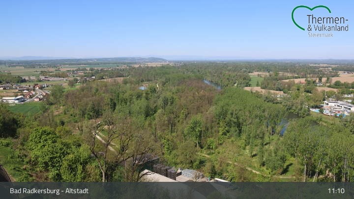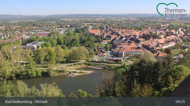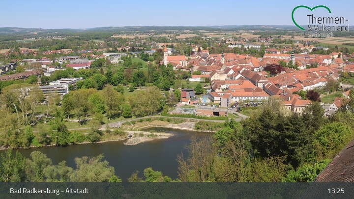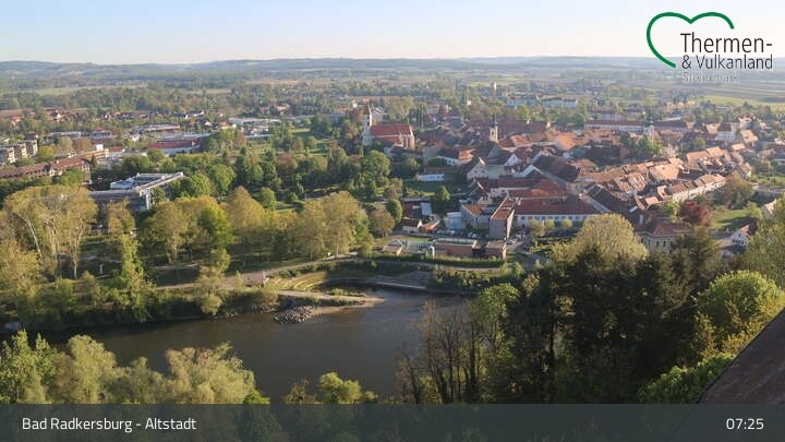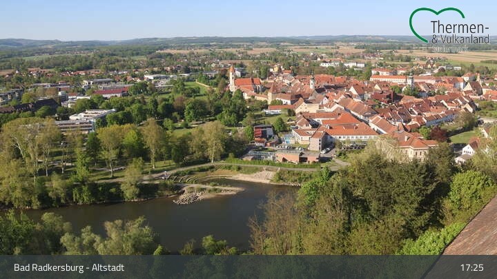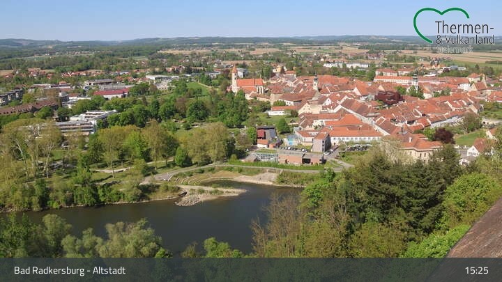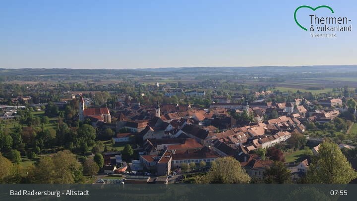 Hier blickst du auf die historische Altstadt von Bad Radkersburg. Du kannst die Stadtpfarrkirche und die Frauenkirche erkennen. Davor befindet sich die Mur, die die Grenze zu Slowenien bildet.