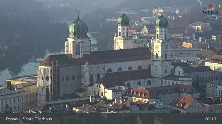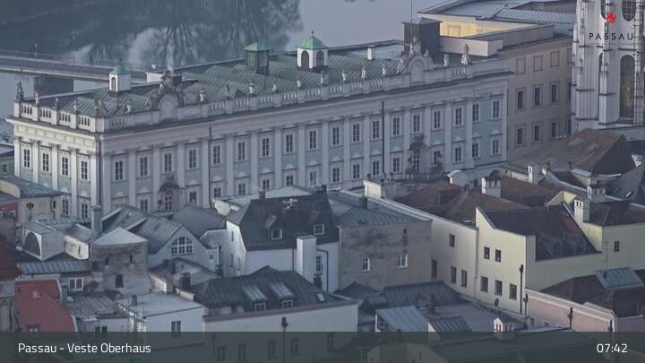 Die Webcam zeigt dir den Blick von der Veste Oberhaus über die Donau zur Altstadt der niederbayerischen Stadt Passau. Sehr gut zu erkennen sind links Teile der Burgveste, die Ortspitze wo die drei Flüsse Donau, Inn und Ilz zusammenfließen, die Hängebrücke über die Donau und rechts der weiße Stephansdom.