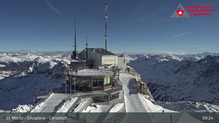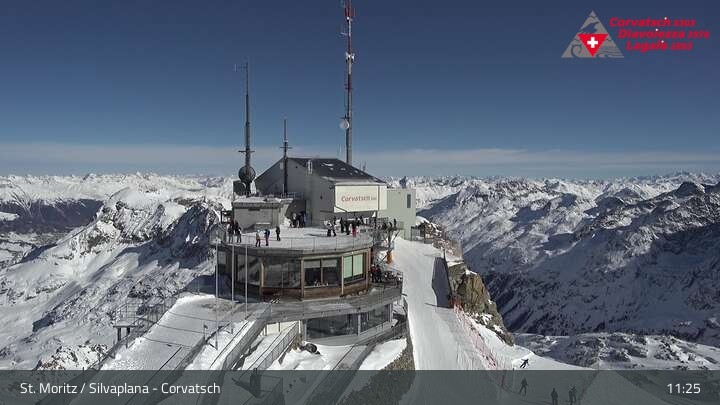 Die Webcam zeigt einen tollen Panoramablick von der Bergstation der Seilbahn am Corvatsch auf den Silvaplanersee.