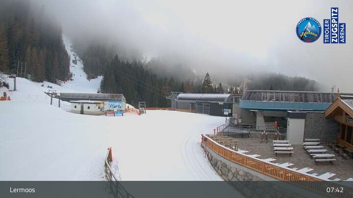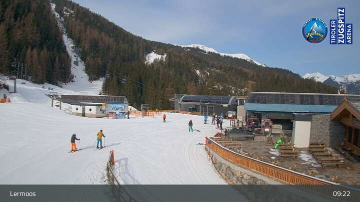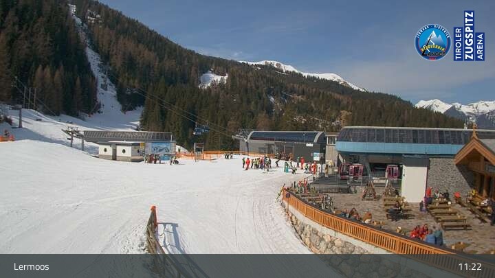 Die Webcam befindet sich an der Bergstation des Hochmoos Express in Lermoos und blickt auf die umliegenden Alpen.