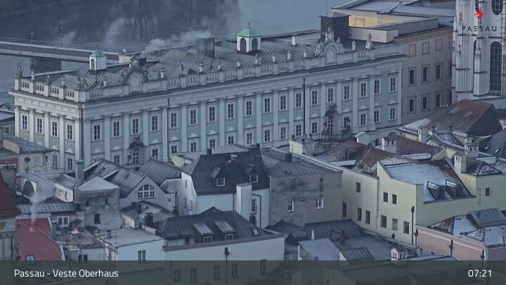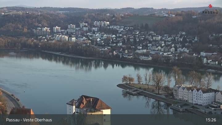 Die Webcam zeigt dir den Blick von der Veste Oberhaus über die Donau zur Altstadt der niederbayerischen Stadt Passau. Sehr gut zu erkennen sind links Teile der Burgveste, die Ortspitze wo die drei Flüsse Donau, Inn und Ilz zusammenfließen, die Hängebrücke über die Donau und rechts der weiße Stephansdom.