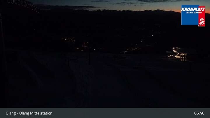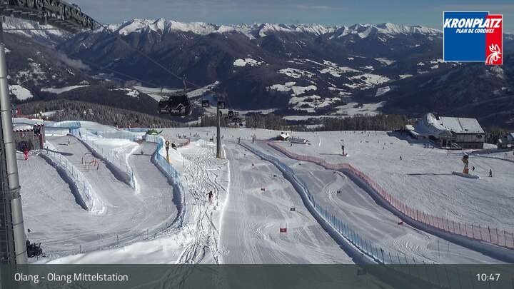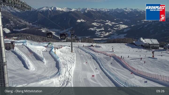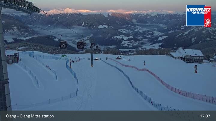 Hier siehst du die Mittelstation der Gondel Olang sowie die umliegende Bergwelt von Kronplatz.