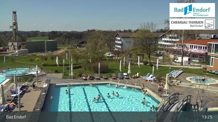 Die Webcam bietet einen Blick das Außengelände der Chiemgau Therme in Bad Endorf. Zu sehen ist unter anderem auch der 125 Meter lange Strömungskanal, ein Highlight der Therme im Landkreis Rosenheim.