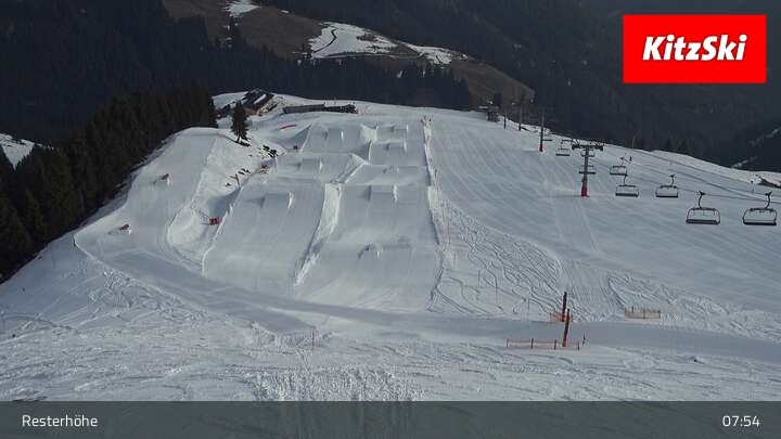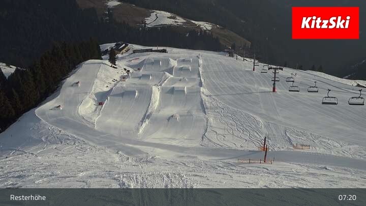 Hier blickst du von der Hangalm auf den Snowpark des Skigebiets Kitzbühel