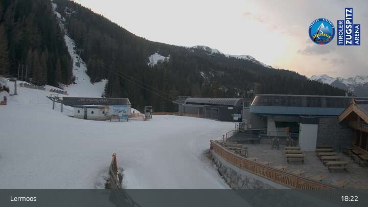 Die Webcam befindet sich an der Bergstation des Hochmoos Express in Lermoos und blickt auf die umliegenden Alpen.