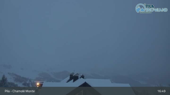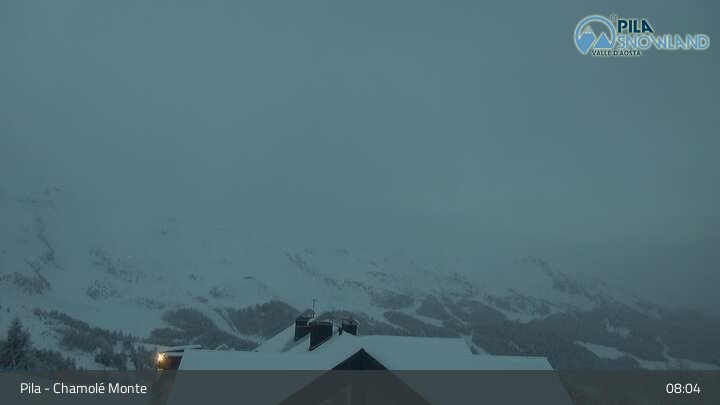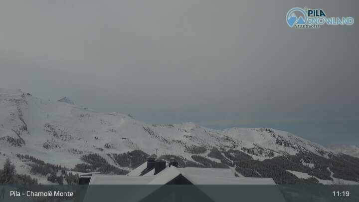 Die Webcam befindet sich an der Bergstation des Chamolé Sessellifts und blickt über die Berge des Aostatals.