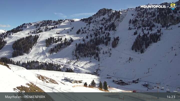 Hier blickst du auf den Vans Penken Park sowie den Sun-Jet Lift im Skigebiet Mayrhofen.