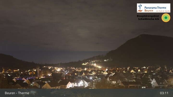 Blick über Beuren in der Schwäbischen Alb. Die Webcam befindet sich in der Panorama Therme Beuren.