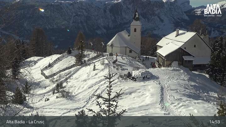 Blick von der Bergstation des La Crusc Sessellifts auf die Berge rund um Alta Badia. Die kleine Kirche ist ein beliebtes Wallfahrtsziel.