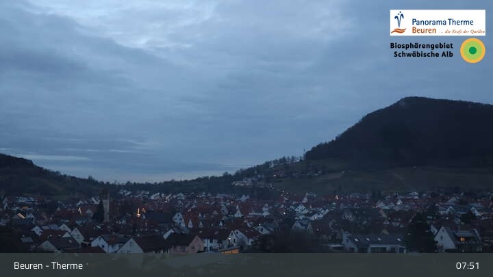 Blick über Beuren in der Schwäbischen Alb. Die Webcam befindet sich in der Panorama Therme Beuren.
