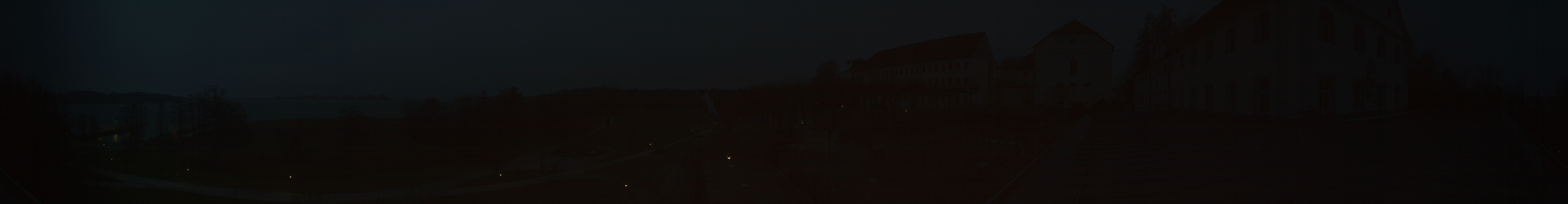 360-Grad-Panoramablick von der Schlosswirtschaft auf der Herreninsel im Chiemsee auf die Schiffsanlegestelle. Zu sehen sind auf dem Bild auch das Augustiner-Chorherrenstift und die benachbarte Fraueninsel. Auf der Herreninsel befindet sich auch das berühmte Schloss Herrenchiemsee von König Ludwig II.