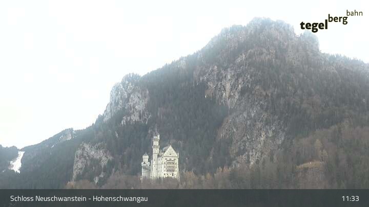 Die Kamera befindet sich am Schloss Hohenschwangau und schwenkt vom Schloss Neuschwanstein zum Museum der Bayerischen Könige.