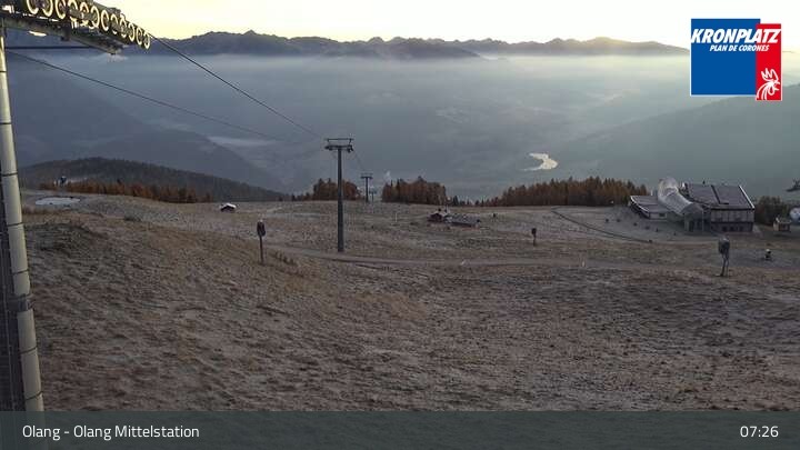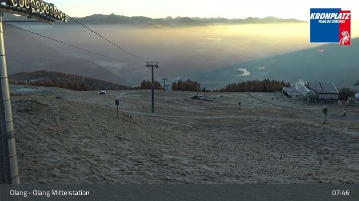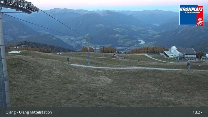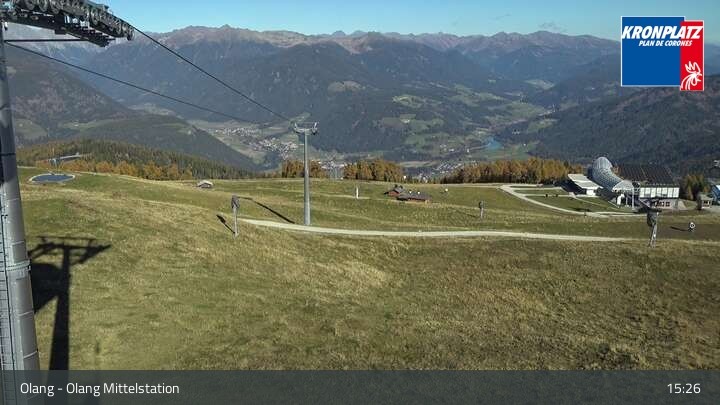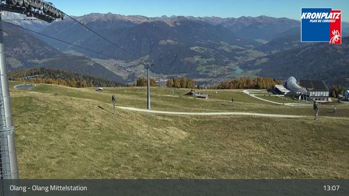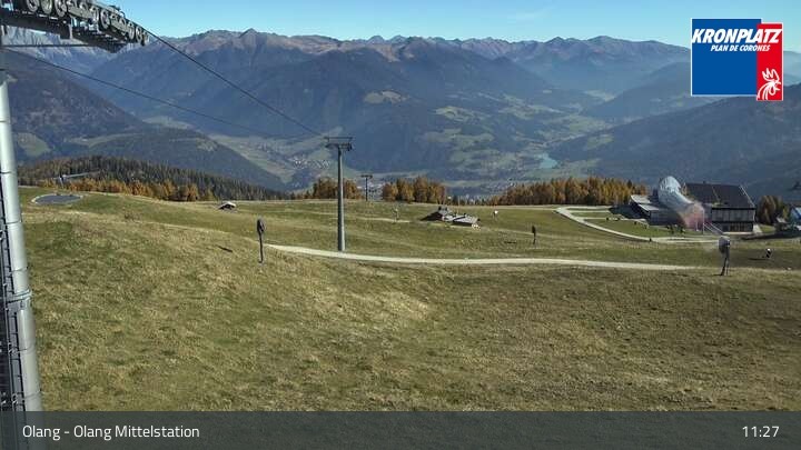 Hier siehst du die Mittelstation der Gondel Olang sowie die umliegende Bergwelt von Kronplatz.