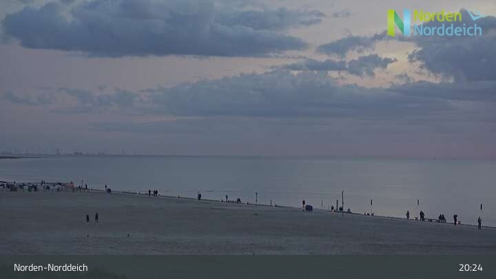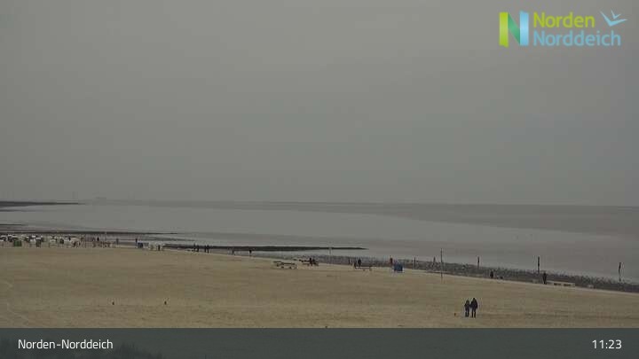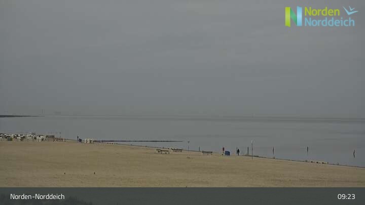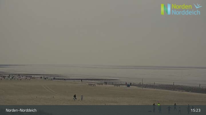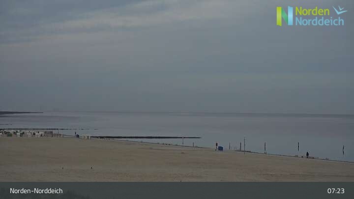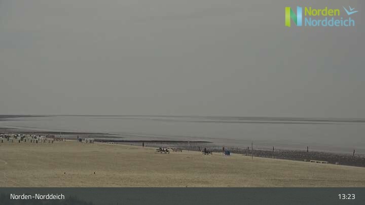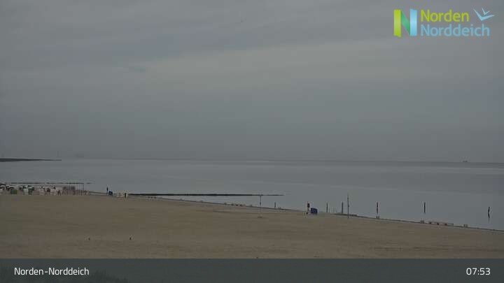 Blick auf den Strand von Norden-Norddeich an der Nordsee. Auf dem Webcambild kannst du im Sommer gut die vielen Strandkörbe erkennen. Die DLRG hat auch eine Station am Strand.