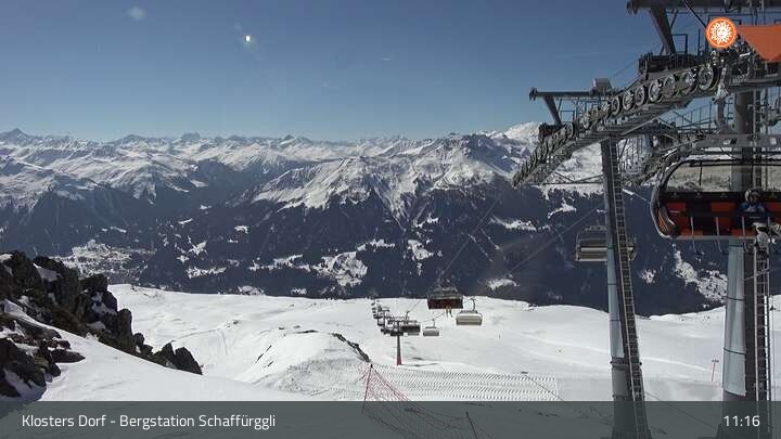 Diese Webcam zeigt die Bergstation des Schaffürggli Lifts auf der Madrisa. Der 2.770 m hohe Berg in den schweizer Alpen bietet vielfältige Wander- und Erlebniswege.