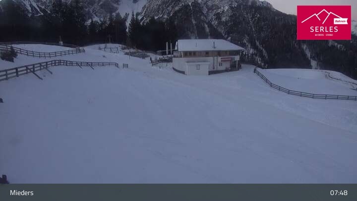 Die Webcam eröffnet den Blick von der Bergstation Koppeneck auf den Hausberg von Mieders, die Serles. Zu sehen sind außerdem das Bergrestaurant Koppeneck mit Kinderspielplatz und der Speichersee.