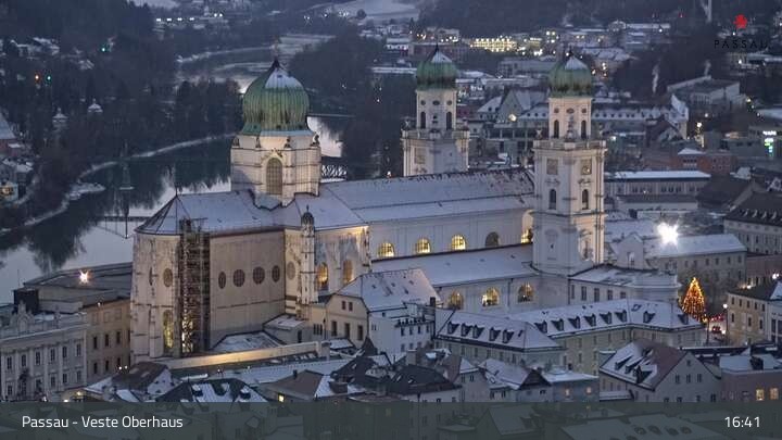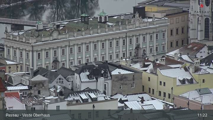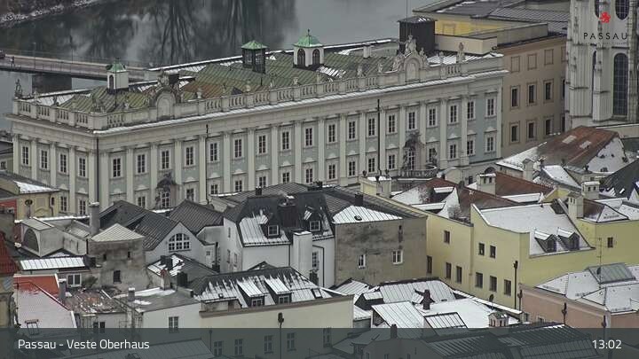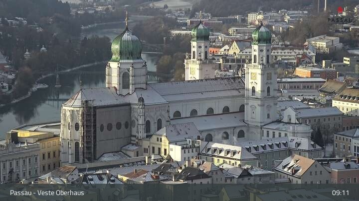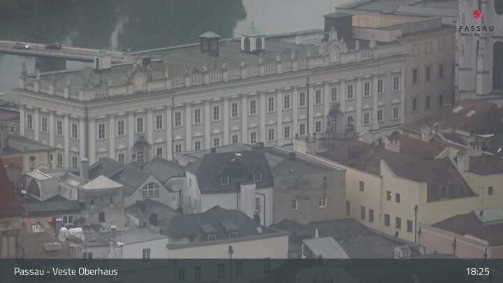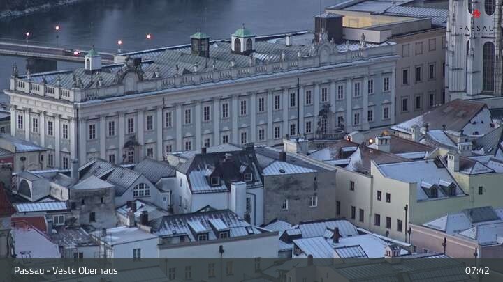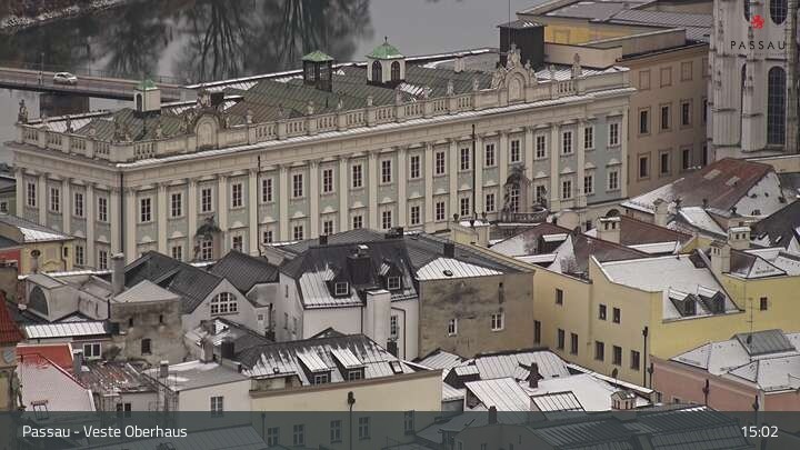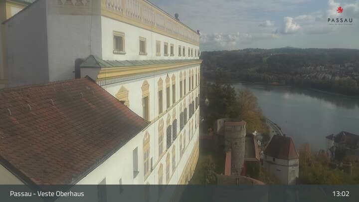 Die Webcam zeigt dir den Blick von der Veste Oberhaus über die Donau zur Altstadt der niederbayerischen Stadt Passau. Sehr gut zu erkennen sind links Teile der Burgveste, die Ortspitze wo die drei Flüsse Donau, Inn und Ilz zusammenfließen, die Hängebrücke über die Donau und rechts der weiße Stephansdom.