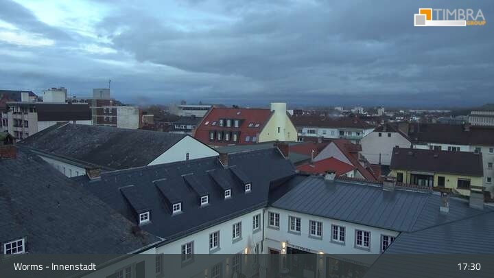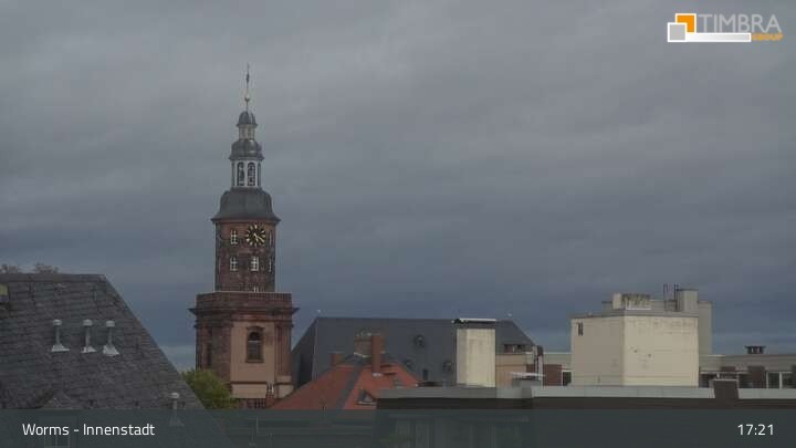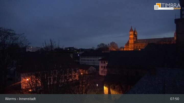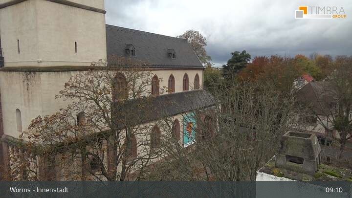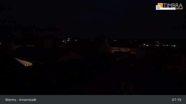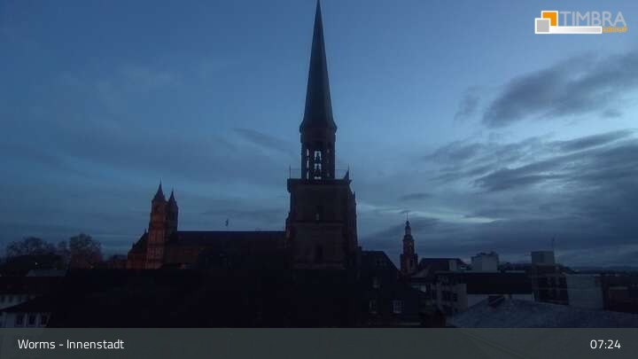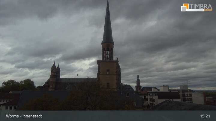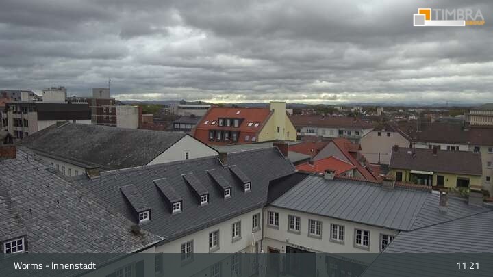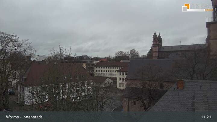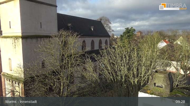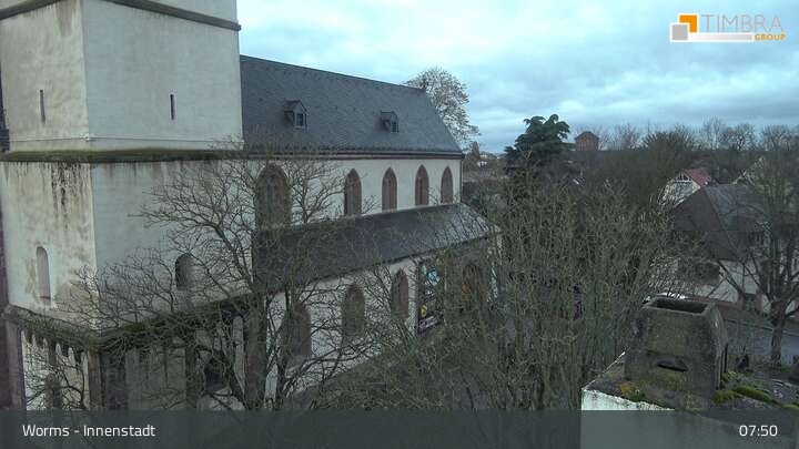 Die Webcam befindet sich in der Wormser Innenstadt. Der Blick wandert von der Magnuskirche, hinter welcher die Türme des Wormser Doms St. Peter zu sehen ist über die Dächer der Stadt bis zum Andreasstift und der Stadtmauer.
