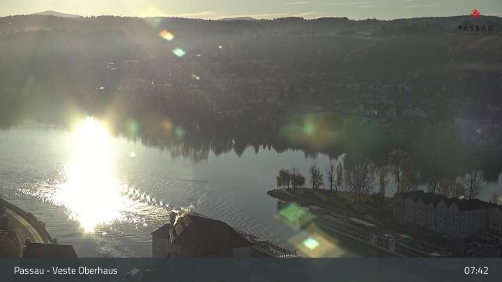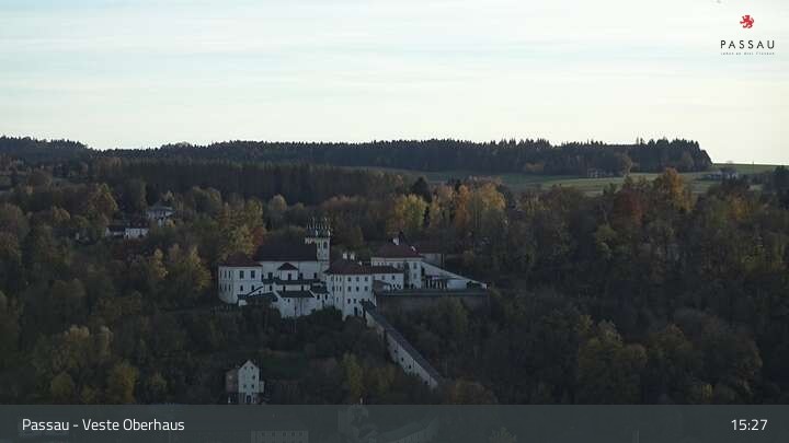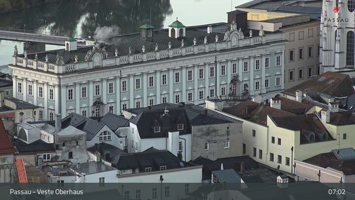 Die Webcam zeigt dir den Blick von der Veste Oberhaus über die Donau zur Altstadt der niederbayerischen Stadt Passau. Sehr gut zu erkennen sind links Teile der Burgveste, die Ortspitze wo die drei Flüsse Donau, Inn und Ilz zusammenfließen, die Hängebrücke über die Donau und rechts der weiße Stephansdom.