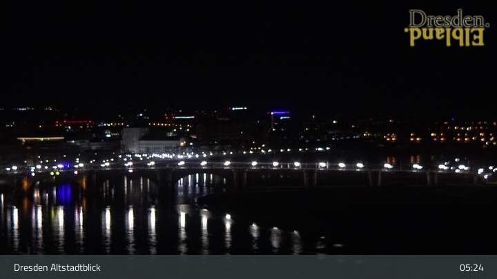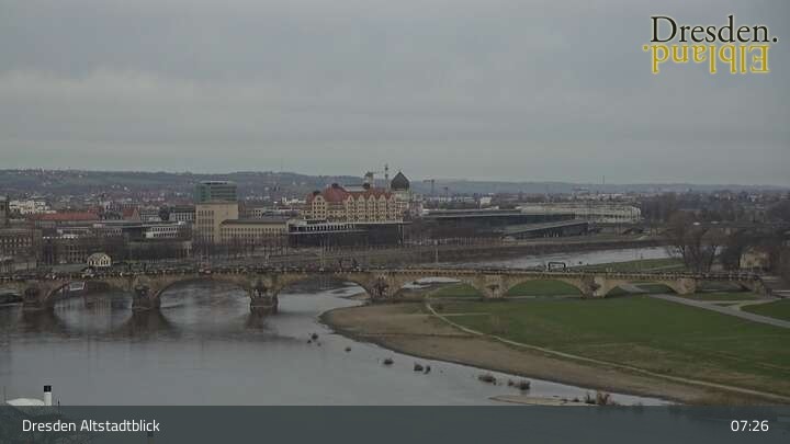 Die Kamera befindet sich am Hotel am Terrassenufer in Dresden und blickt auf die Altstadt und die Elbe.