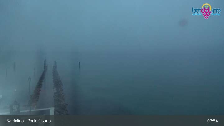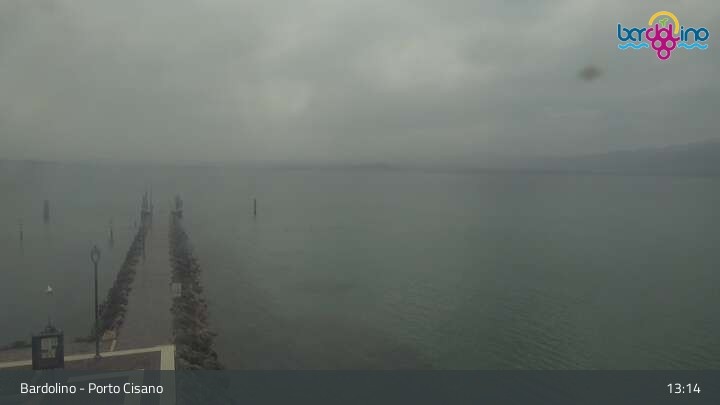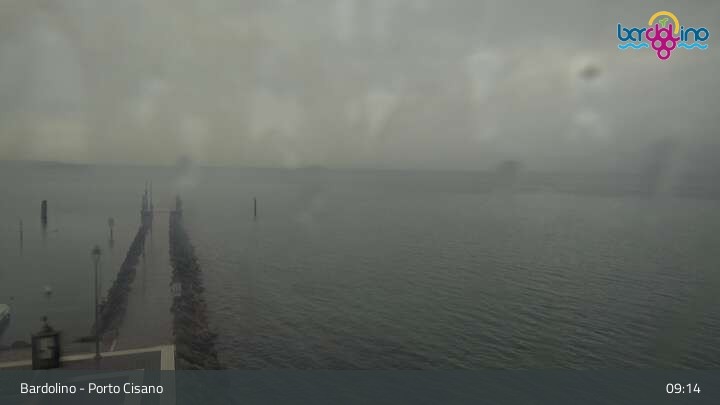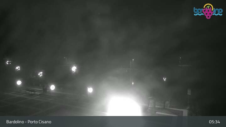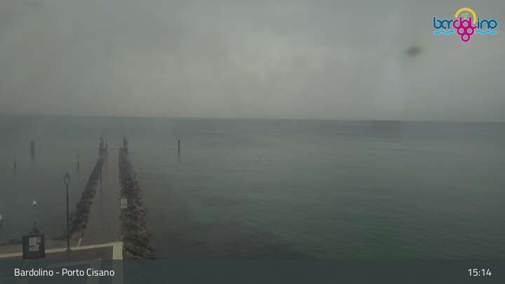 Die Kamera befindet sich am Strand Lido Mirabello und blickt nach Norden auf den Hafen von Bardolino am Gardasee.
