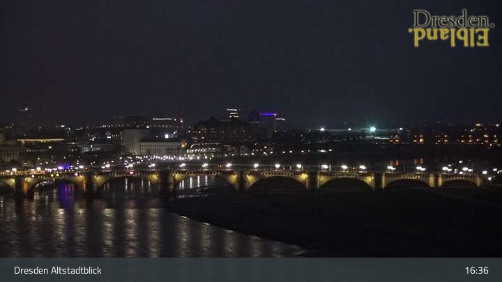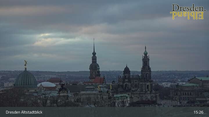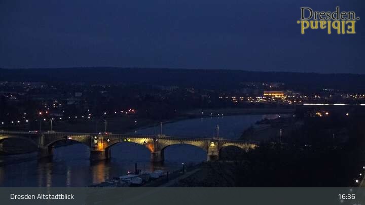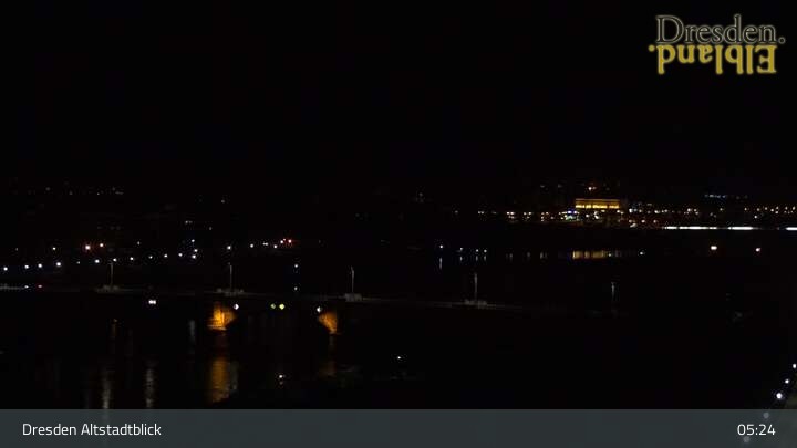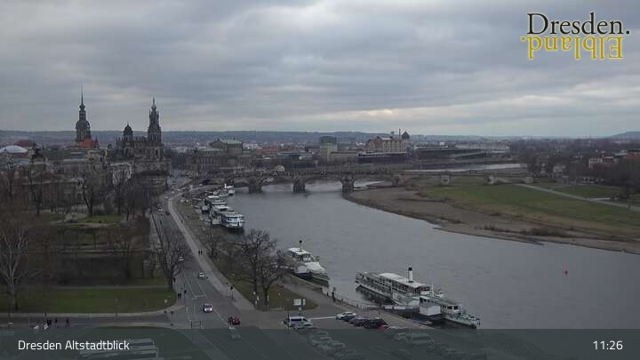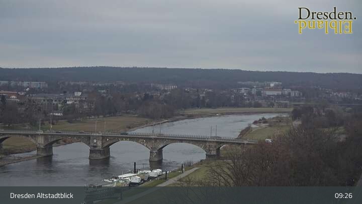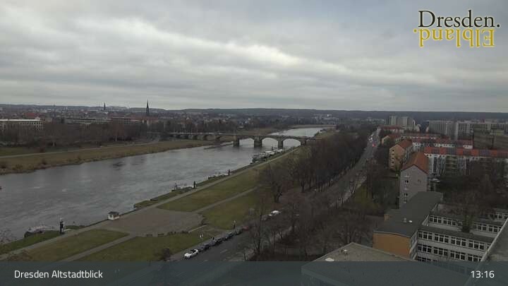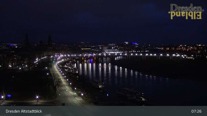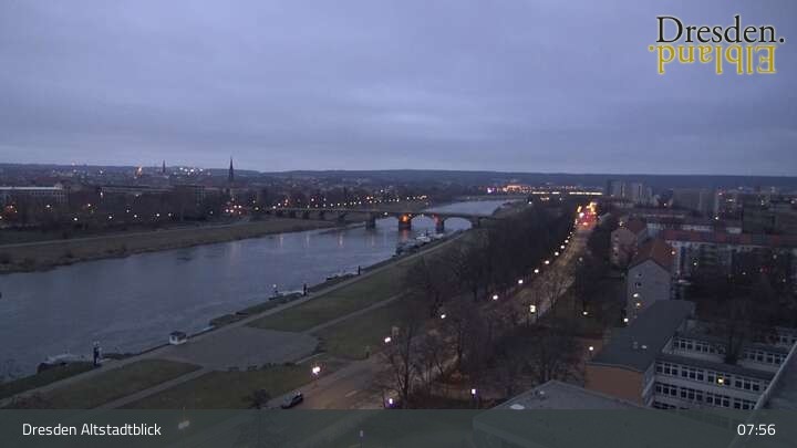 Die Kamera befindet sich am Hotel am Terrassenufer in Dresden und blickt auf die Altstadt und die Elbe.