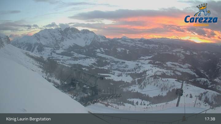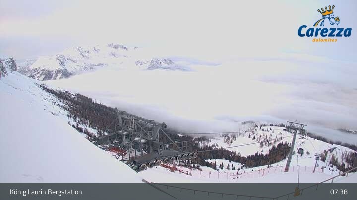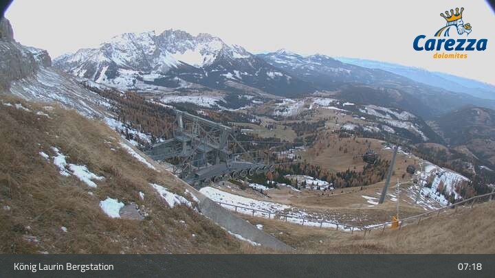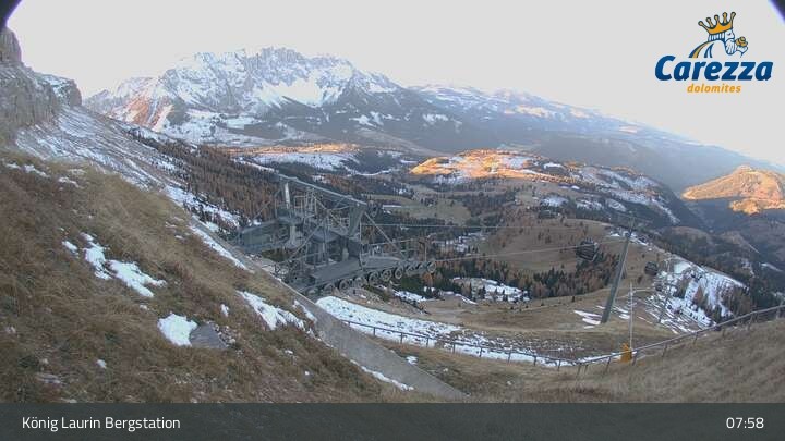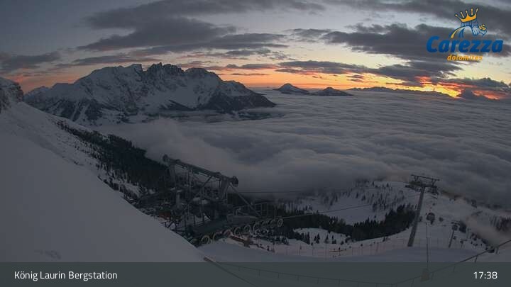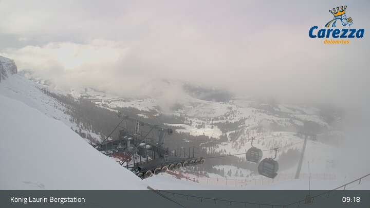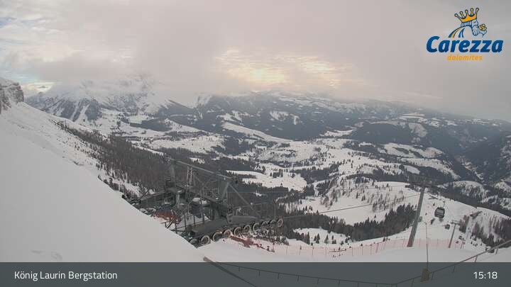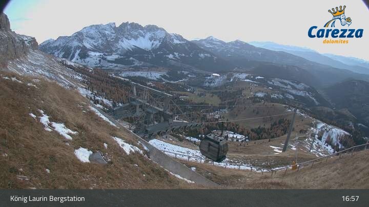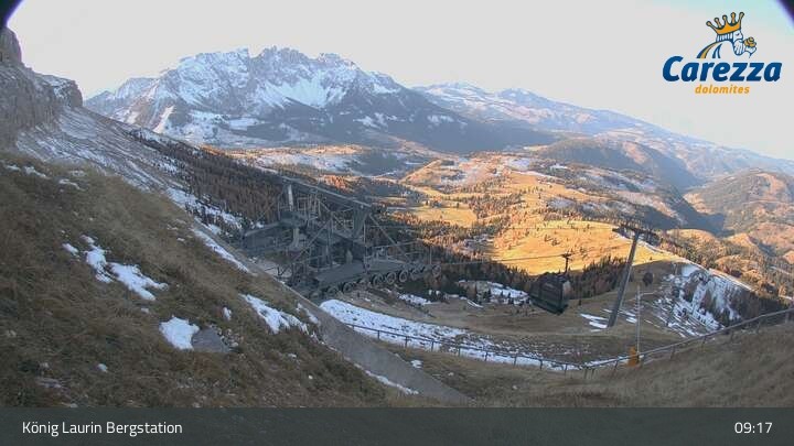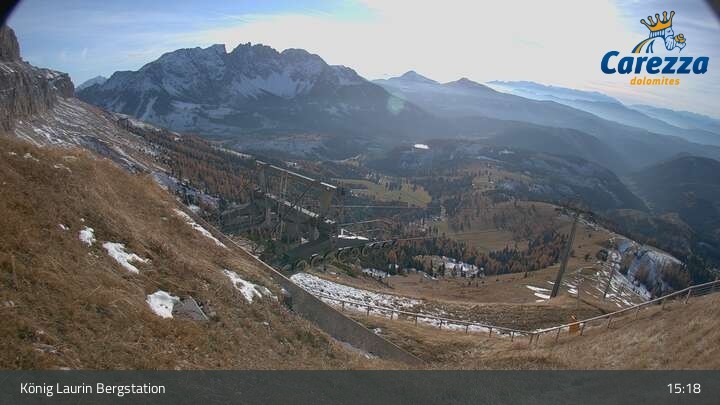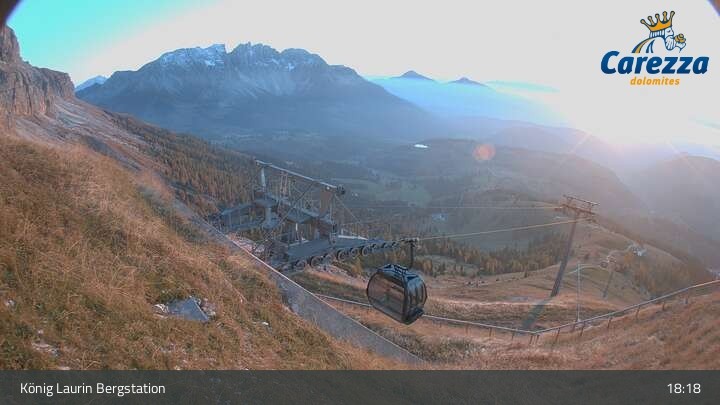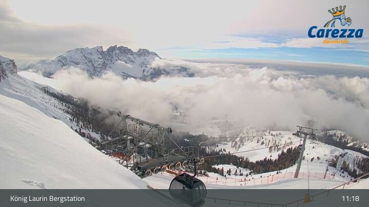 Die Webcam eröffnet von der Kölner Hütte das Panorama zum Latemar. Du siehst hier auch gut die neue König Laurin Gondelbahn mit unterirdischer Bergstation.