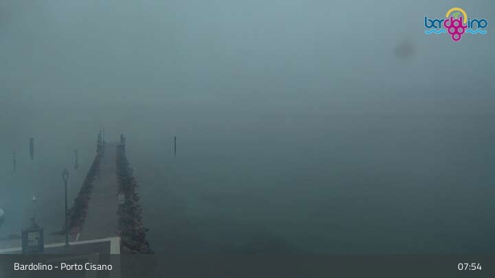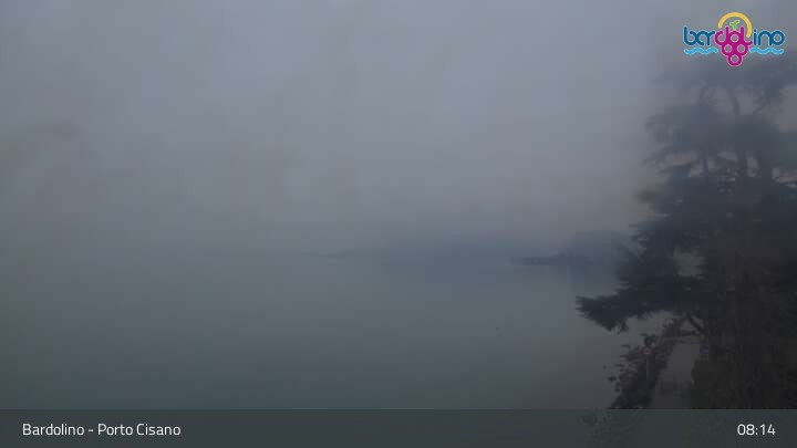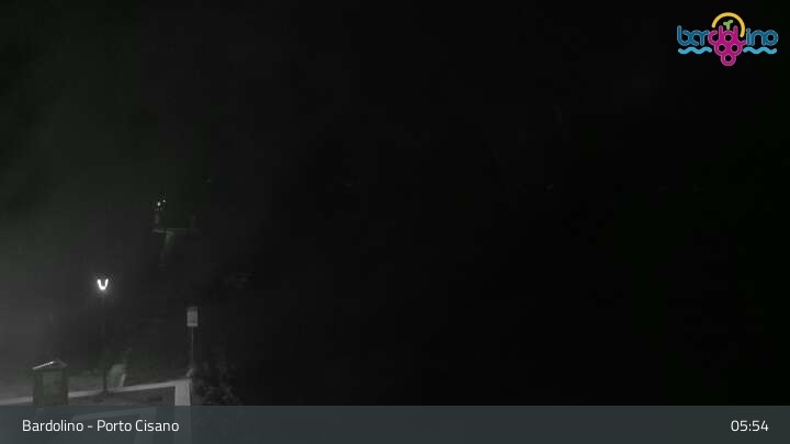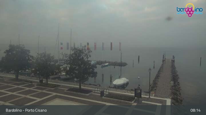 Die Kamera befindet sich am Strand Lido Mirabello und blickt nach Norden auf den Hafen von Bardolino am Gardasee.