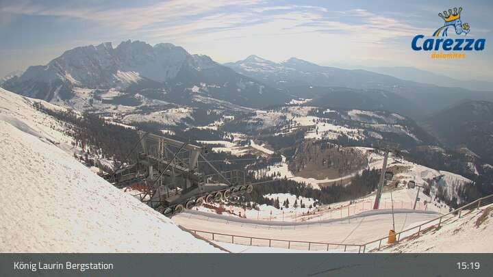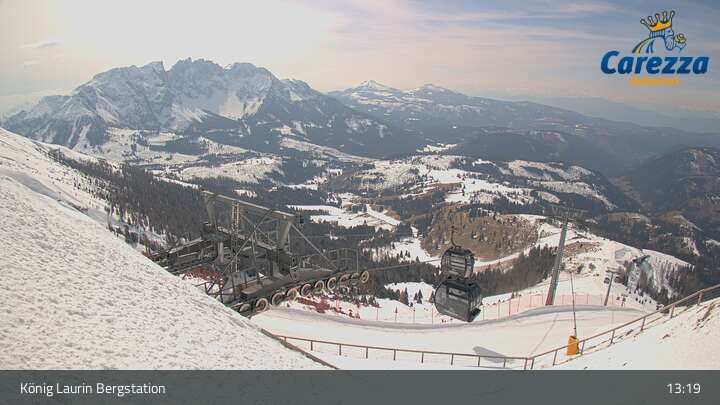 Die Webcam eröffnet von der Kölner Hütte das Panorama zum Latemar. Du siehst hier auch gut die neue König Laurin Gondelbahn mit unterirdischer Bergstation.